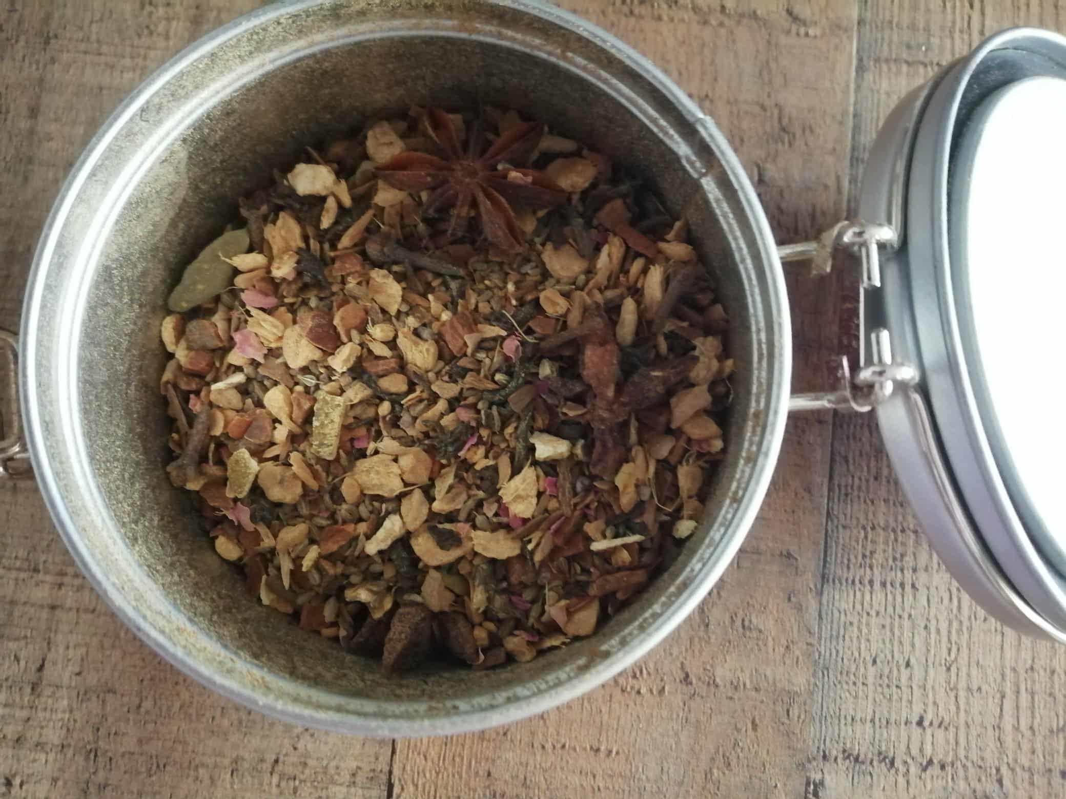 riz), bâtons de cannelle, thé vert China Sencha, écorces d‘orange, arôme