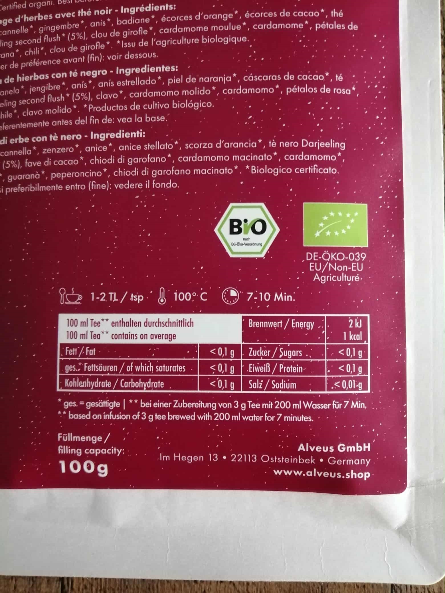 d‘orange*, écorces de cacao*, thé noir Darjeeling second flush* (5%),